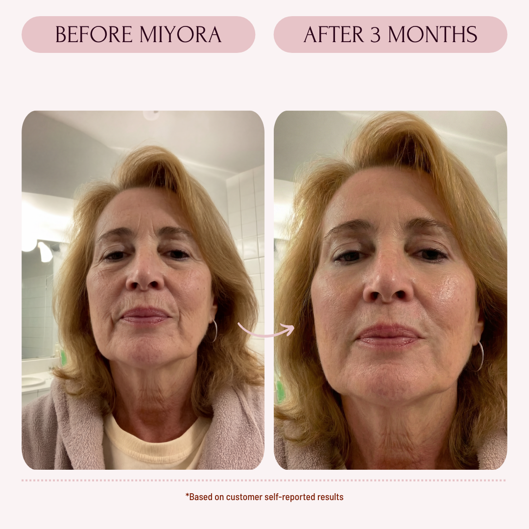 "Honestly, I was skeptical. I've tried so many 'miracle' creams in my life… But after 3 months of the ritual, my husband asked me if I'd gotten Botox. I laughed. No — just Miyora. The eye area is where I noticed it first. Less dark circles, plumper skin. I've been telling all my friends."