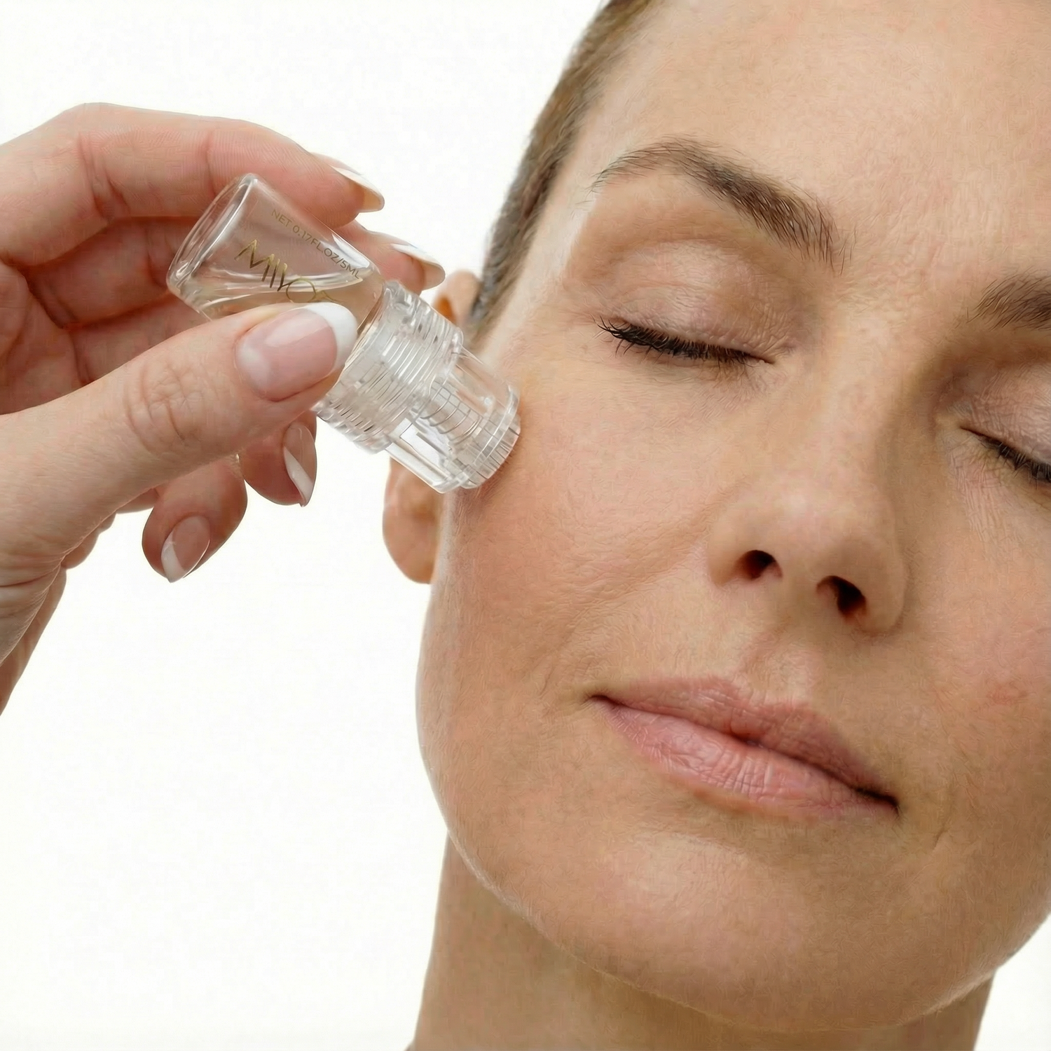 Our 24K gold micro-needles create thousands of micro-channels that allow our Replexium®-enriched hyaluronic acid serum to penetrate 10× deeper — right where real transformation begins.